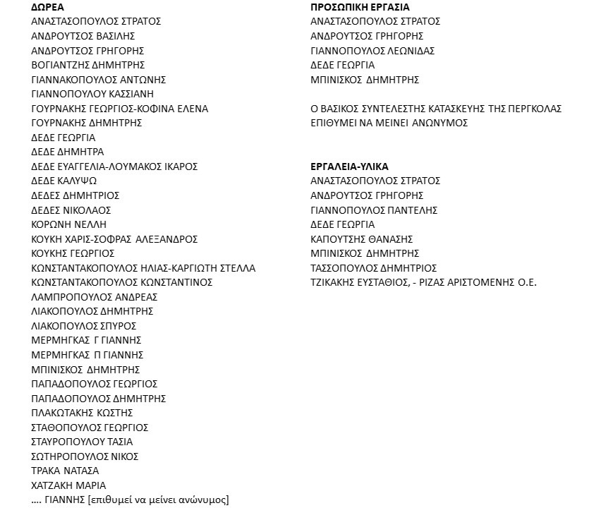 Δράση που πραγματοποιήθηκε με τη στήριξη και τη συνδρομή (χρήματα και προσωπική εργασία) κατοίκων, ατόμων με καταγωγή από το χωριό και επισκεπτών.